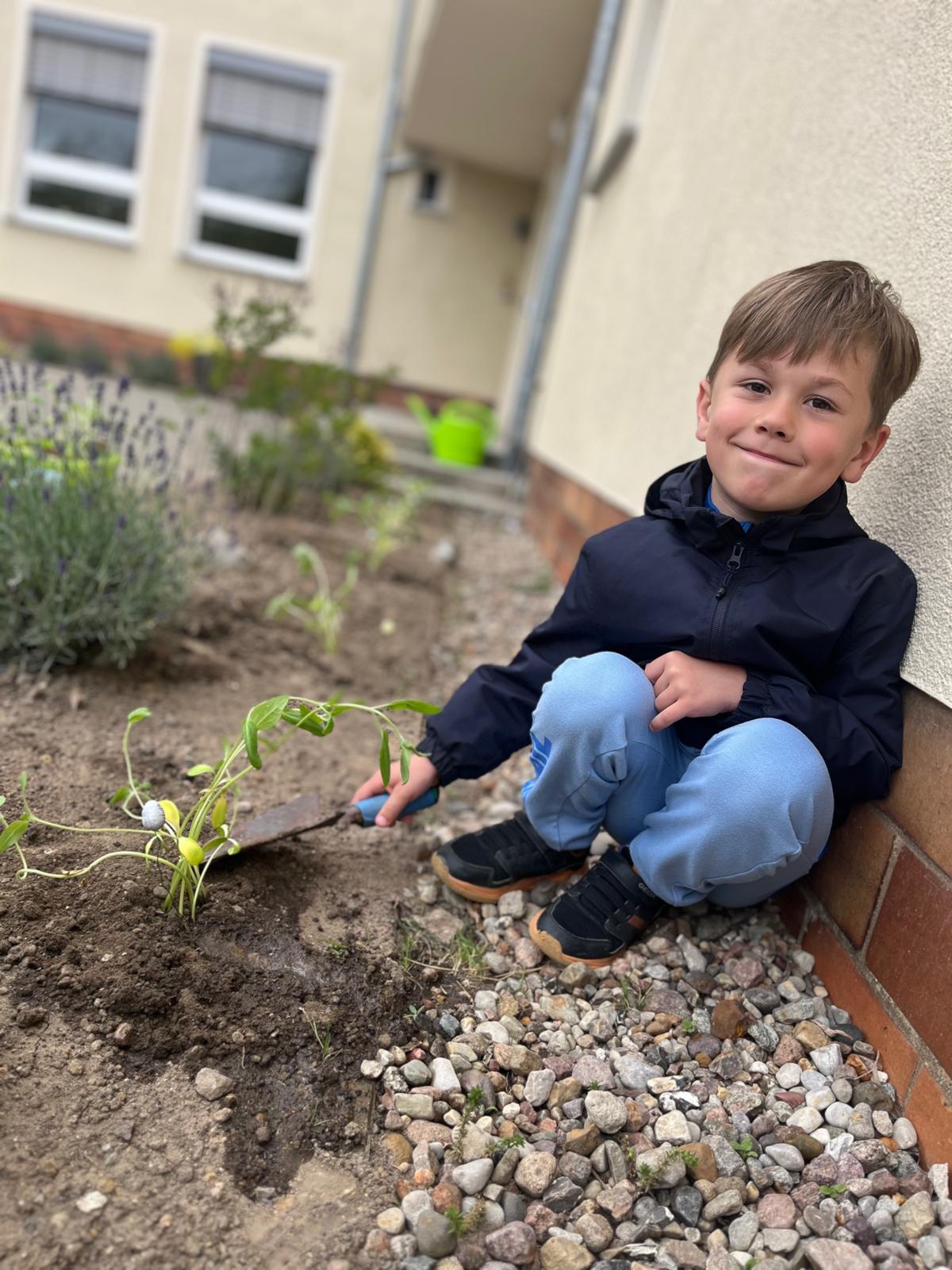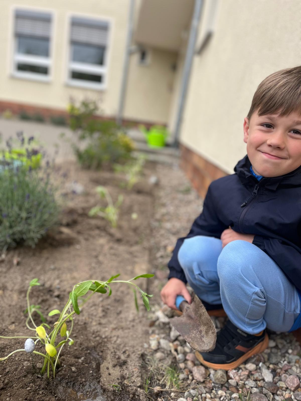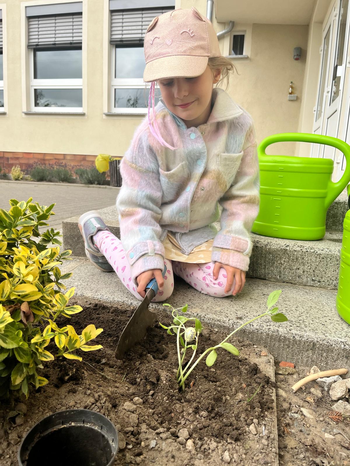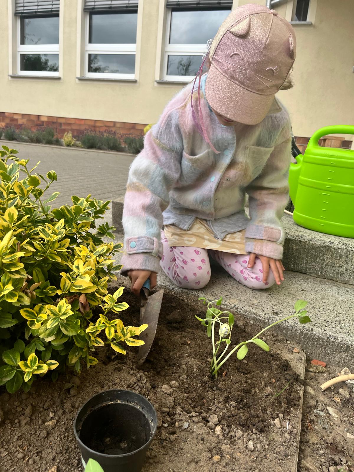 Nun durften die kleinen Sonnenblumen in die Erde vor unserer Schule umziehen – stolz eingepflanzt von unseren kleinen Gärtnerinnen und Gärtnern.