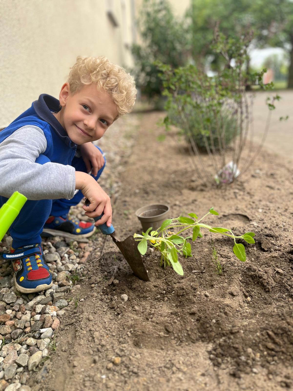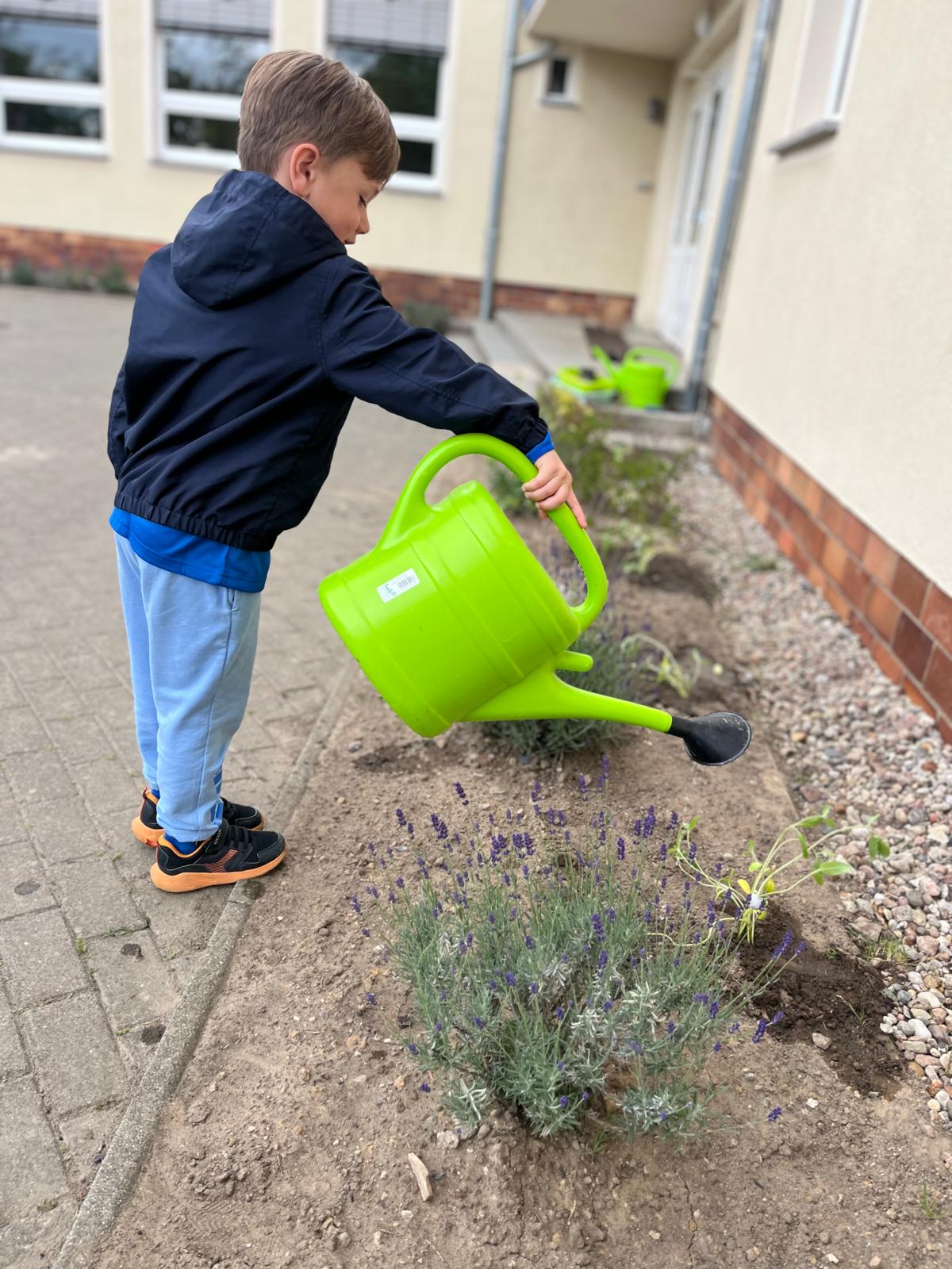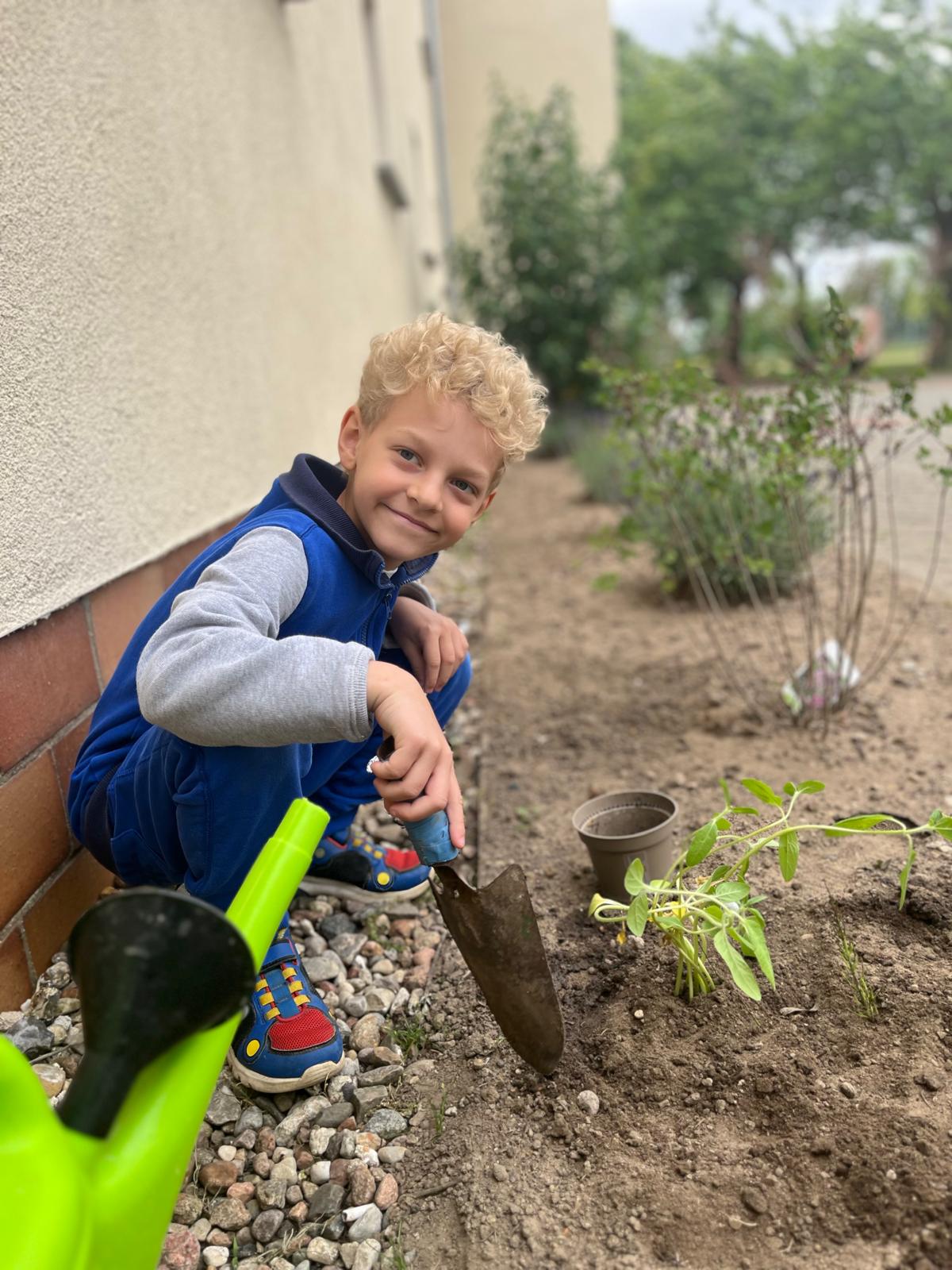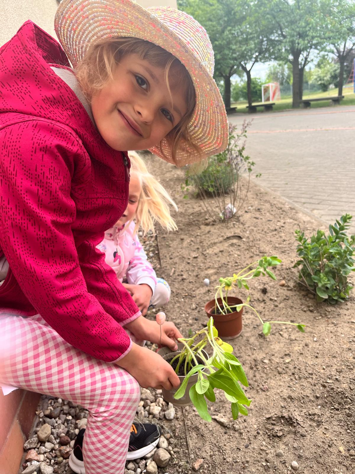Nun durften die kleinen Sonnenblumen in die Erde vor unserer Schule umziehen – stolz eingepflanzt von unseren kleinen Gärtnerinnen und Gärtnern.